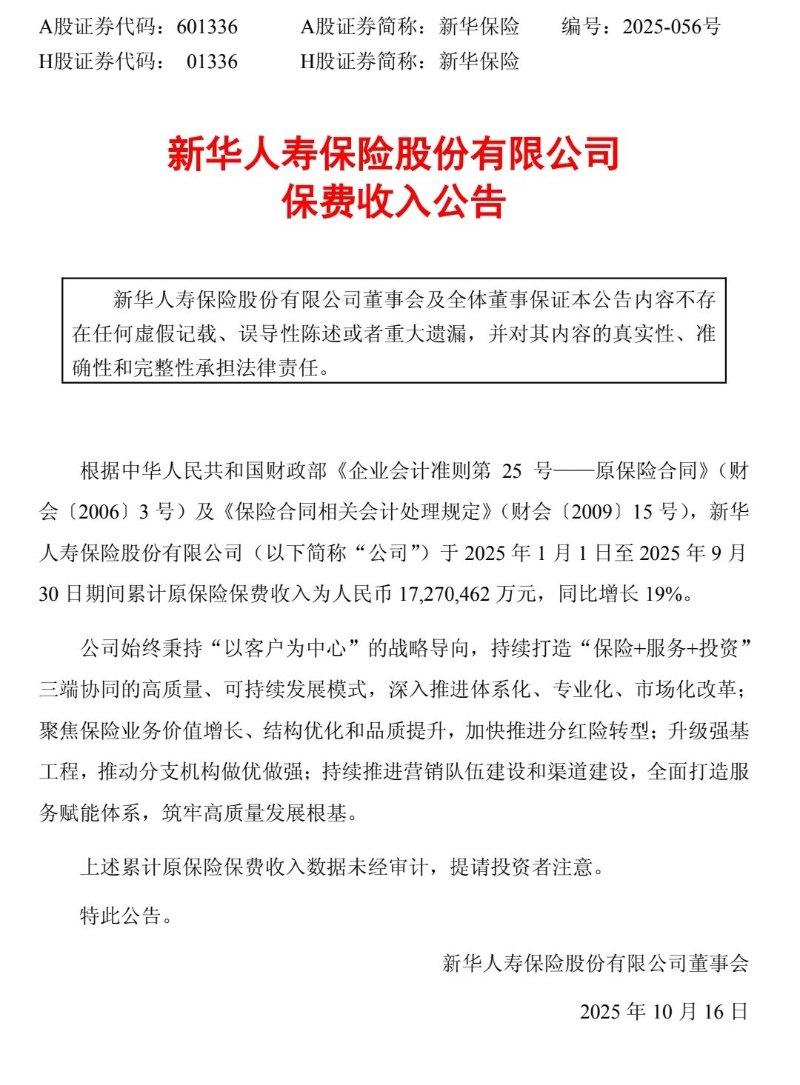 10月16日,新华保险发布公告:公司于2025年1月1日至2025年9月30日期间累计原保险保费收入为人民币17,270,462万元,同比增长19%。