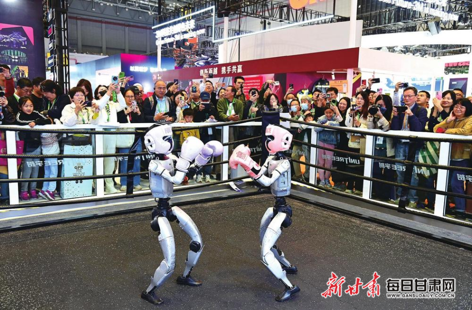 人工智能AI馆里的宇树科技的人形机器人格斗表演吸睛无数。