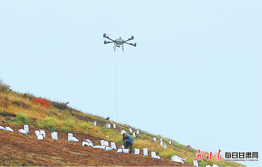 在定西市岷县闾井镇林口村,海拔2800米的山巅上,药农们采挖出一袋袋当归苗,甘肃军红科技有限责任公司的杨均恩操作农用无人机,无人机吊起袋子,稳稳腾空而起,按照预设航线,将当归苗精准投送到山下的货运车,整个过程安全高效。