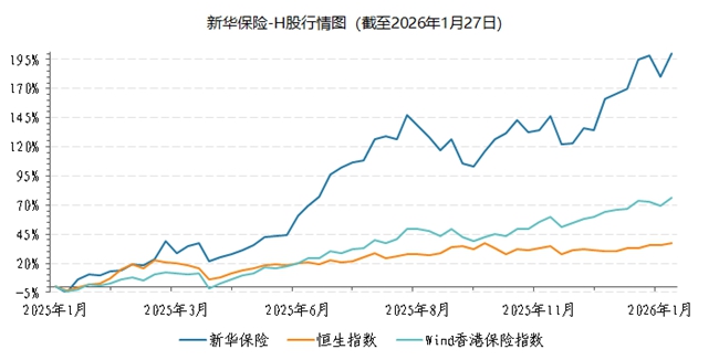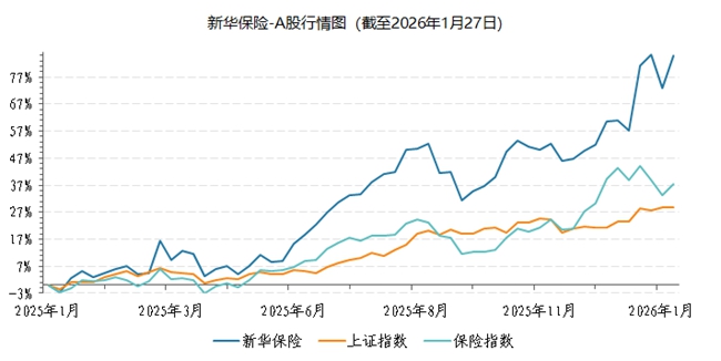 近两年来,乘着业绩向好与行业共振的东风,新华保险股价走出一轮强劲上涨行情。2025年,公司A股年内上涨46.03%,H股涨幅更是高达145.99%,领涨保险板块;2026年开年延续升势,公司股价多次刷新历史纪录,1月13日A股收盘价达83.47元,总市值突破2316亿元,创历史新高,1月16日盘中更是触及85.8元历史新高,稳居高位。这根向上的K线,绝非偶然,而是新华保险以战略为纲、以经营为基、以服务为魂,共同绘就的高质量发展画卷。每一个股价高点的背后,都是步步为营的实干和久久为功的深耕。